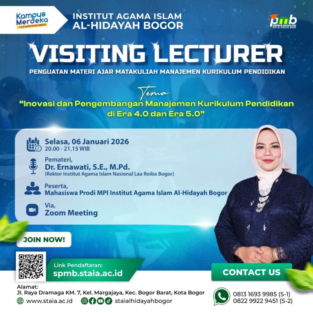 Bogor – Program Studi Manajemen Pendidikan Islam Institut Agama Islam Al-Hidayah Bogor kembali menunjukkan komitmennya dalam meningkatkan kualitas akademik dan relevansi pembelajaran dengan menyelenggarakan kegiatan Visiting Lecturer bertajuk Penguatan Materi Ajar Mata Kuliah Manajemen Kurikulum Pendidikan. Kegiatan ini dilaksanakan secara daring pada Selasa, 6 Januari 2026, pukul 20.00–21.30 WIB melalui platform Zoom Meeting.